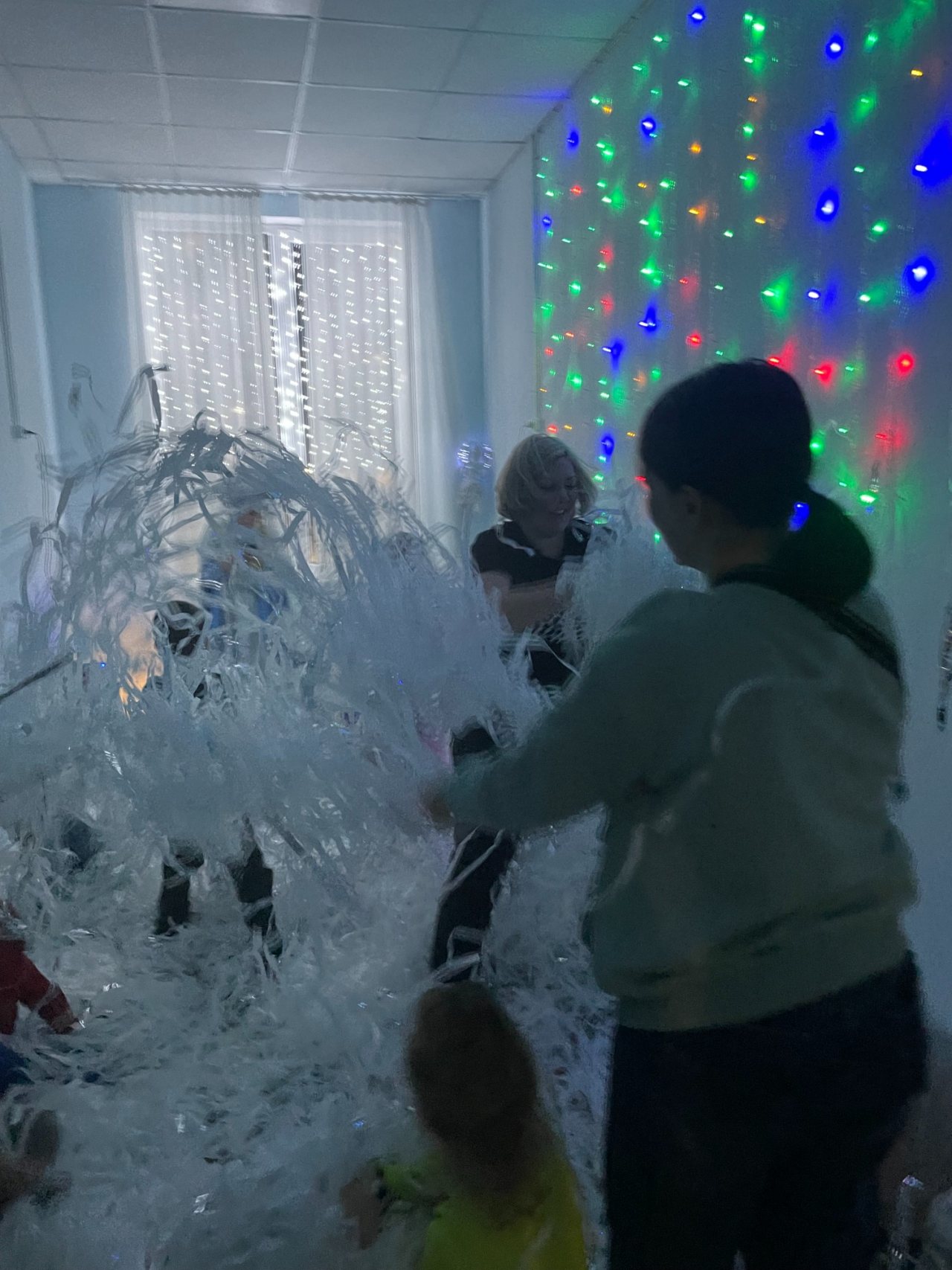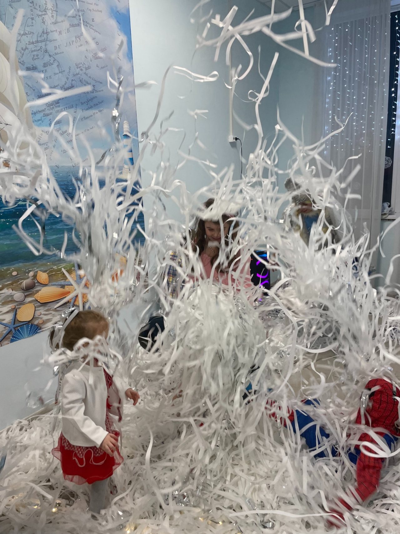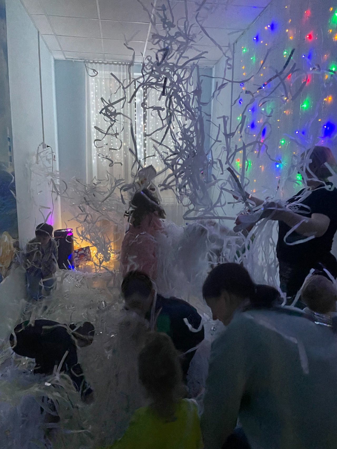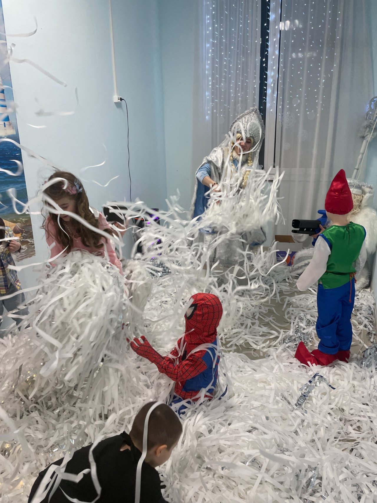 Собрались дети в новогодних костюмах, нарядные родители и самые настоящие Дед Мороз и Снегурочка! Ребята пели песни, танцевали, соревновались, смотрели спектакль и даже играли в снежки! Дедушке Морозу очень понравились стихотворения, которые прочитали мальчики и девочки, и поэтому все получили подарки. А после этого, как веселая зимняя вьюга, была бумажная вечеринка! Все взлетало и кружилось, дети прыгали, закапывались в мягких горах, бросались, танцевали в бумажках под новогоднюю музыку!