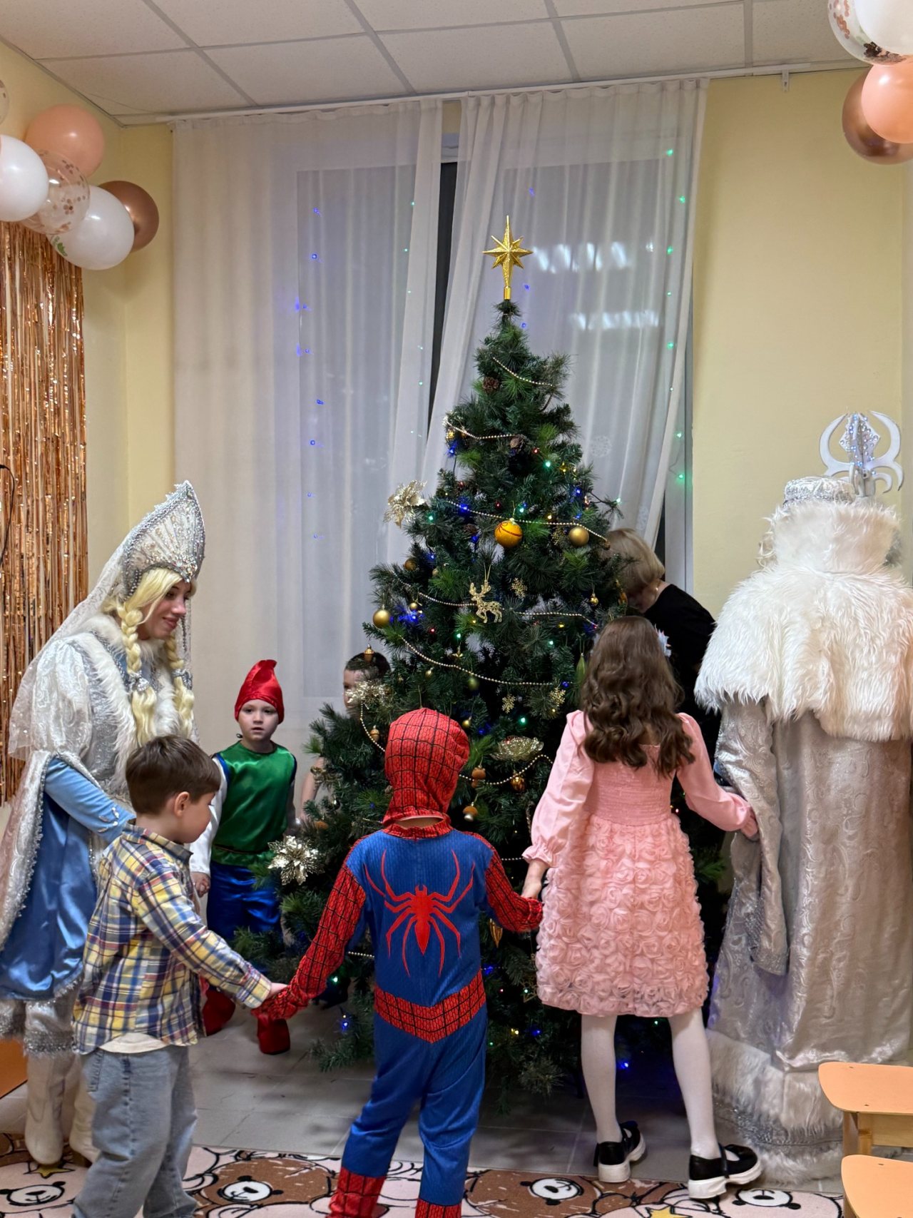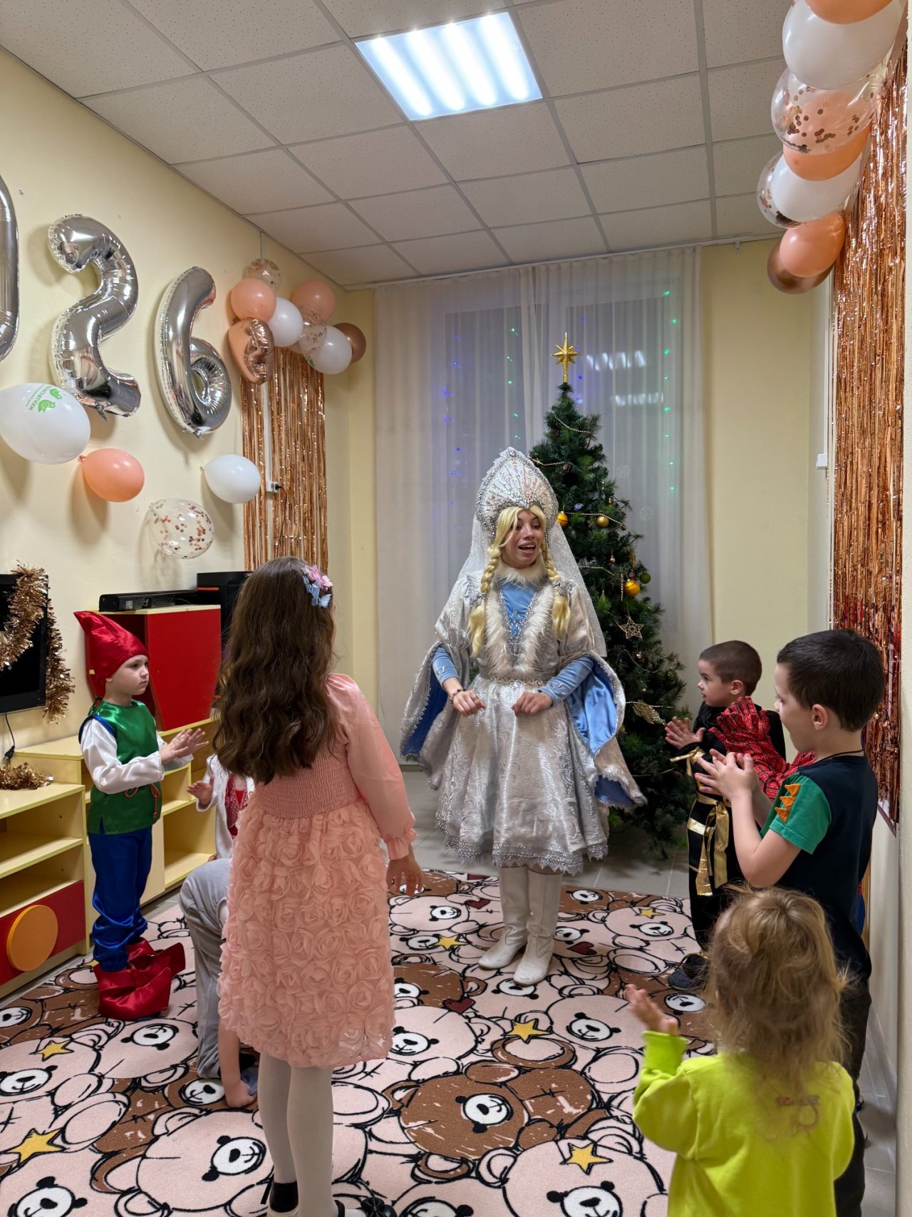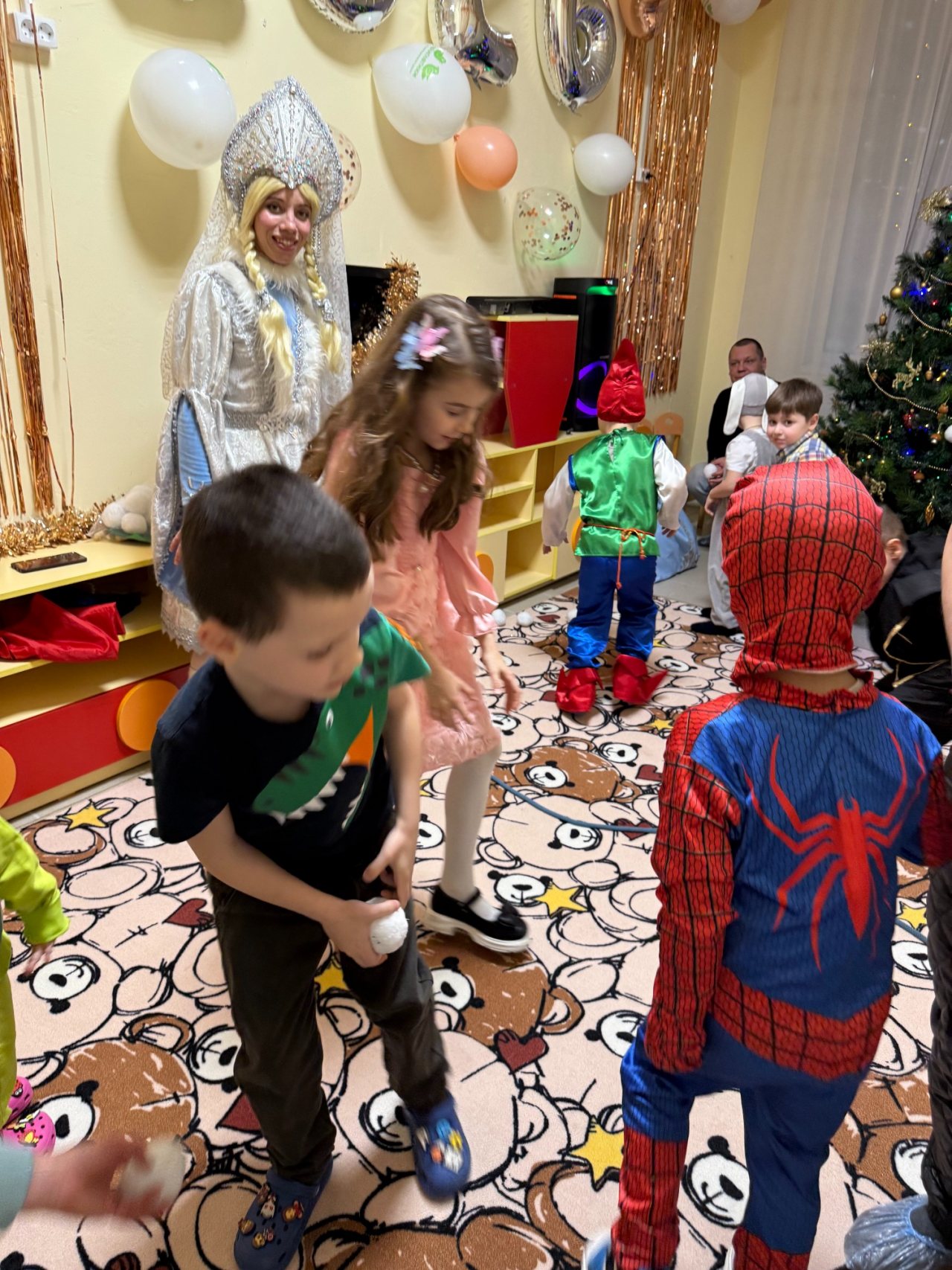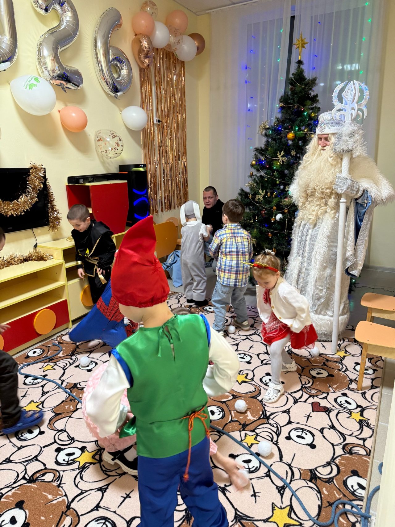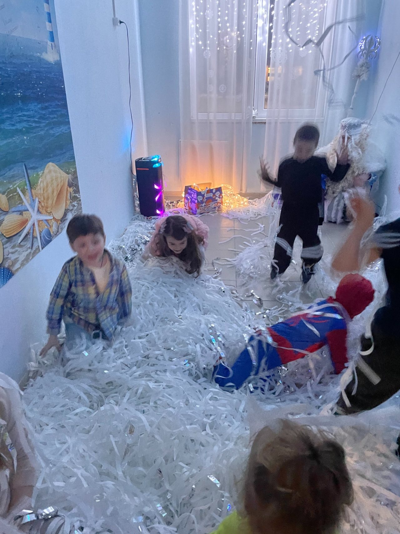 Собрались дети в новогодних костюмах, нарядные родители и самые настоящие Дед Мороз и Снегурочка! Ребята пели песни, танцевали, соревновались, смотрели спектакль и даже играли в снежки! Дедушке Морозу очень понравились стихотворения, которые прочитали мальчики и девочки, и поэтому все получили подарки. А после этого, как веселая зимняя вьюга, была бумажная вечеринка! Все взлетало и кружилось, дети прыгали, закапывались в мягких горах, бросались, танцевали в бумажках под новогоднюю музыку!