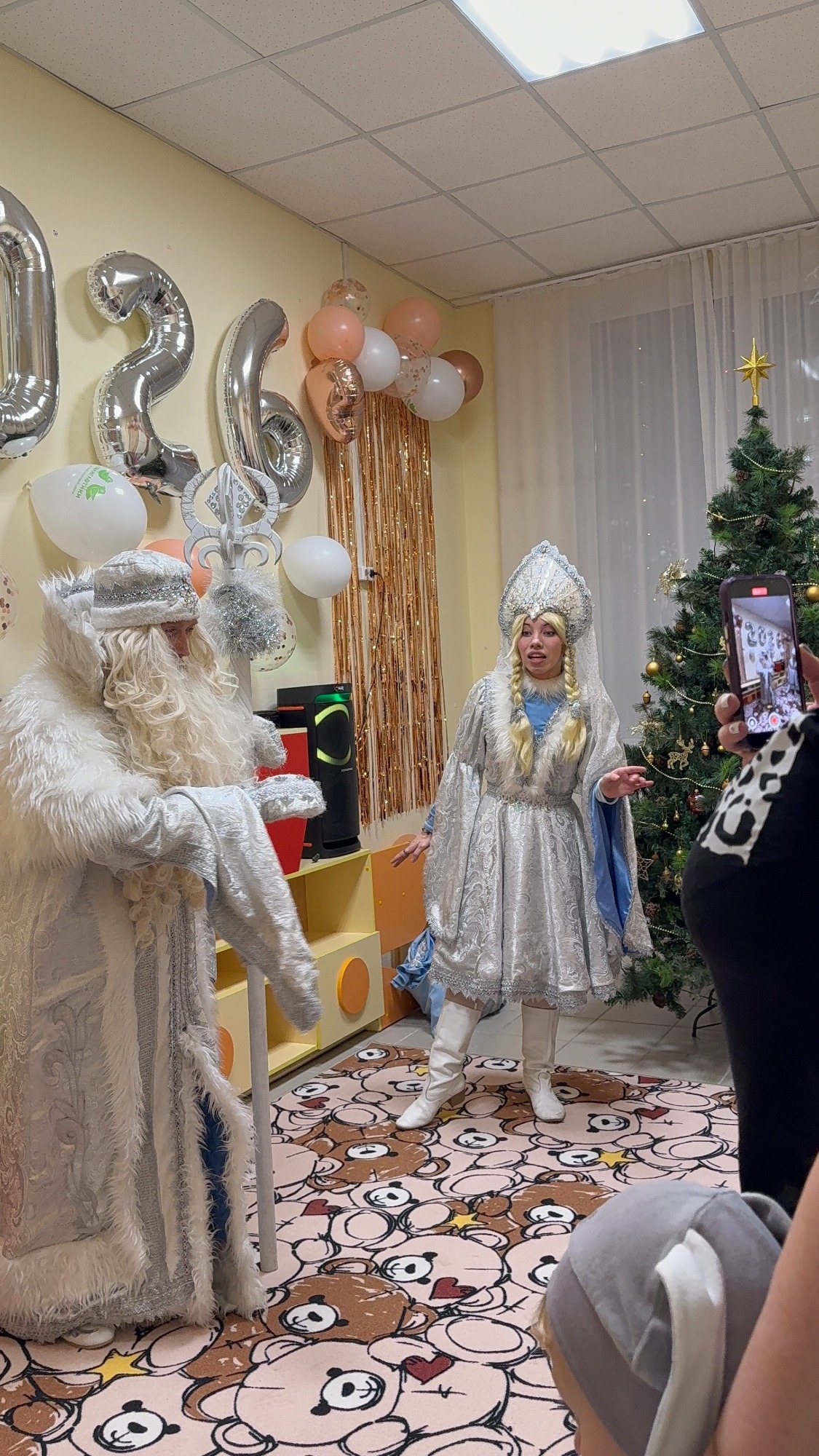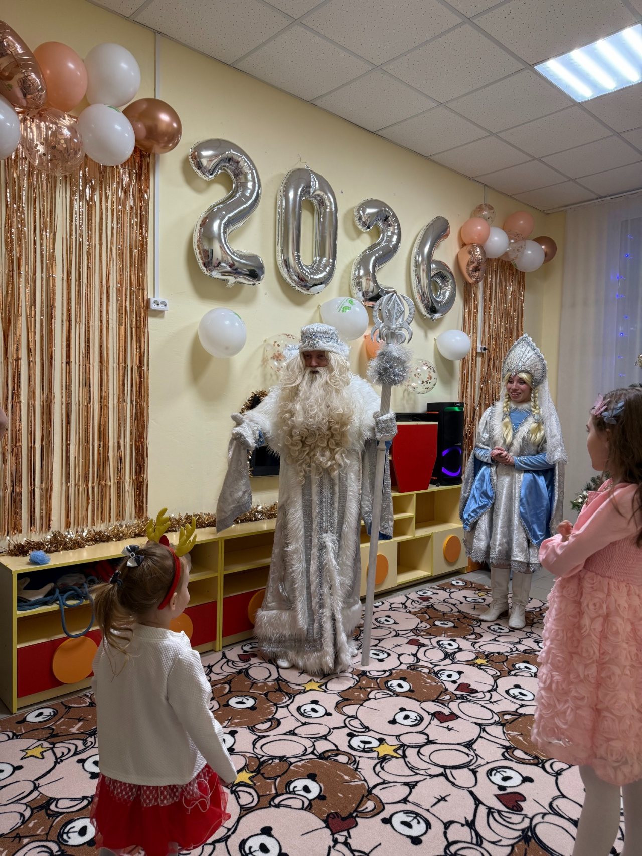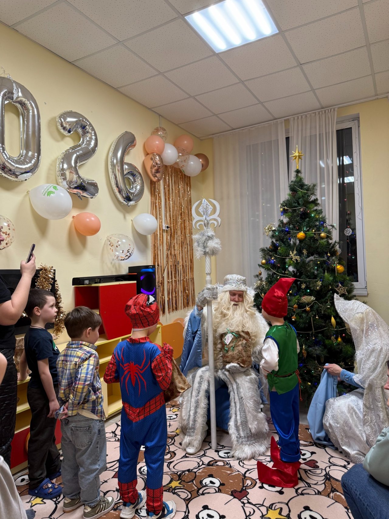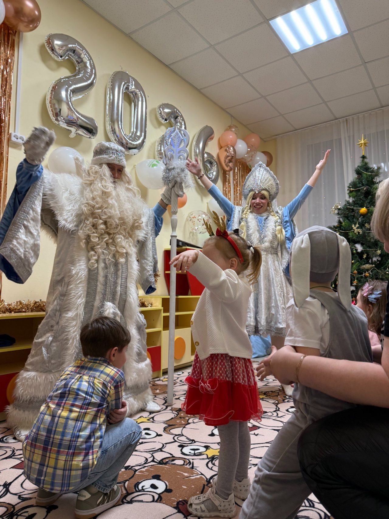 Собрались дети в новогодних костюмах, нарядные родители и самые настоящие Дед Мороз и Снегурочка! Ребята пели песни, танцевали, соревновались, смотрели спектакль и даже играли в снежки! Дедушке Морозу очень понравились стихотворения, которые прочитали мальчики и девочки, и поэтому все получили подарки. А после этого, как веселая зимняя вьюга, была бумажная вечеринка! Все взлетало и кружилось, дети прыгали, закапывались в мягких горах, бросались, танцевали в бумажках под новогоднюю музыку!